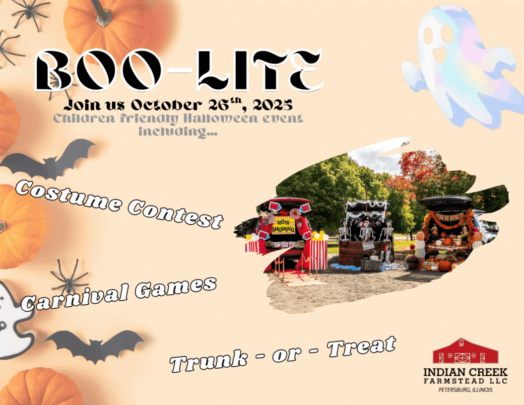 Here at Indian Creek Farmstead LLC, we're always looking for new ways to create unforgettable experiences for our guests—whether it's taking in the scenic beauty of our fields on a relaxing tractor-pulled wagon ride or watching little ones explore, laugh, and play in our Barnyard. There's something special here for everyone! As the seasons change, so do our events, so check back often to make sure you don’t miss out! Below, you’ll find a full list of our upcoming events, complete with dates and times, so you can plan your visit accordingly. If you have any questions about our upcoming events, scheduling, and more, give us a call at 217-717-4401 today!